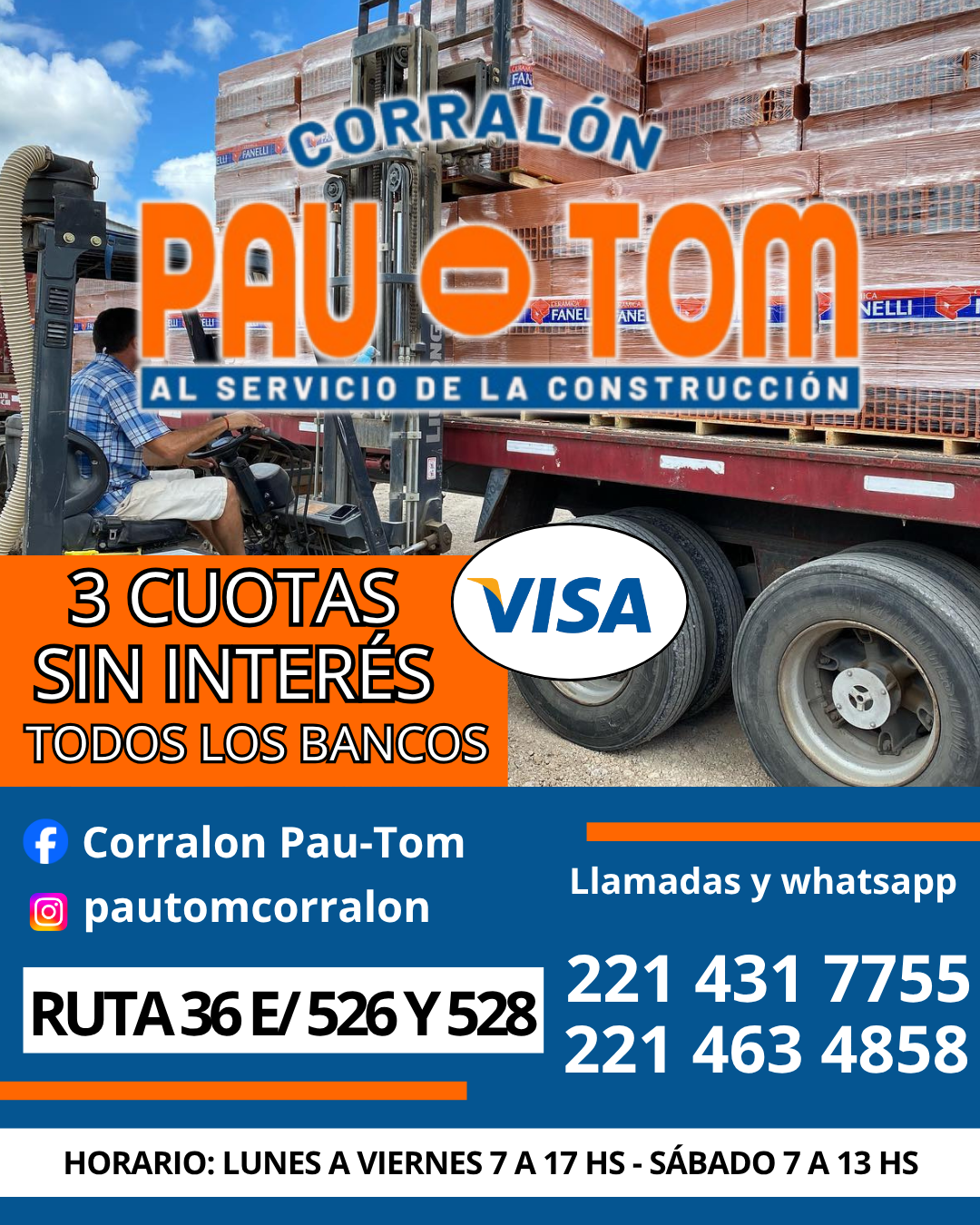 CONSTRUCCIÓN, TODOS CORRALÓN PAU-TOM COMPARTIR #Abasto #Romero | En el Corralón Pau-Tom continúan al servicio de la construcción en la zona oeste de #LaPlata.Ahora podés pagar 3 cuotas sin interés con VISA de todos los bancos.Horario corrido de lunes a viernes 07 a 17hs.Sábado 07 a 13hs. Domingo cerrado. Te esperan en ruta 36 entre 526 Y 528.Comunicate llamando o por whatsapp al 221463-4858Instagram: @pautomcorralon221 431 7755WHATSAPP Author: Departamento de ventas
