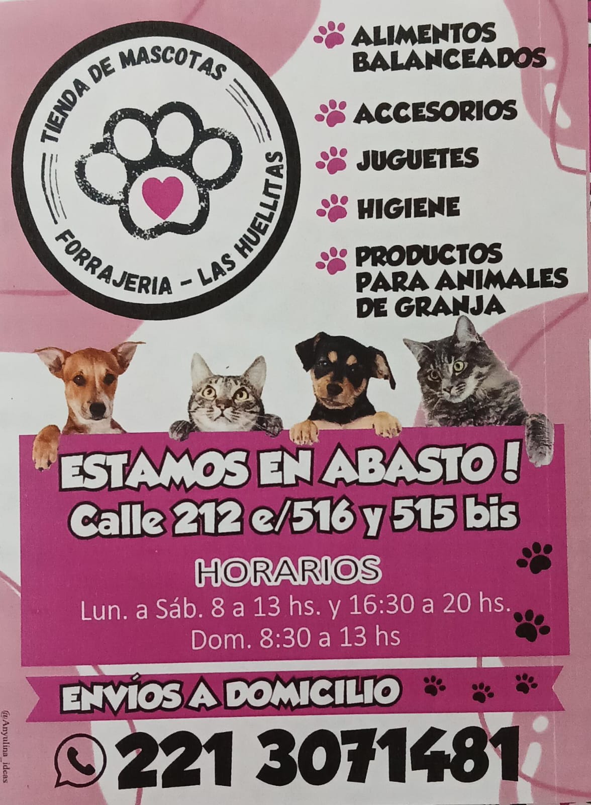 COMERCIO, MASCOTAS LAS HUELLITAS: TIENDA DE MASCOTA Y FORRAJERÍA COMPARTIR #Abasto | En Forrajería Las Huellitas encontrás todo lo que tus mascotas y animales de granja necesitan, en un solo lugar. – Alimentos balanceados– Accesorios– Juguetes– Productos de higiene– Artículos para animales de granja Dirección: Calle 212 entre 515 bis y 516 Horarios:Lunes a sábados: 8:00 a 13:00 hs y 16:30 a 20:00 hsDomingos: 8:30 a 13:00 hs Envíos a domicilio Pedidos y consultas por WhatsApp:221 307 1481 Forrajería Las Huellitas: Cuidamos a los que más querés, todos los días. Author: Departamento de ventas